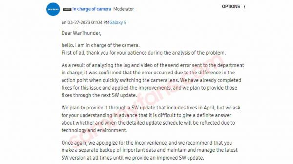 三星软件部门确认这个 BUG 是由于快速切换摄像头时,动作点不同步导致的。IT之家从官方说明中获悉,三星官方内部已经制作出了补丁,目前正在测试阶段,预估将于 4 月更新中向用户推送。