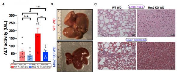 除了改善代谢,长期食用高脂饮食通常容易造成肝脏变性和肝细胞癌,不过这些事情都不会发生在MRS2缺陷小鼠身上,这些小鼠在实验周期肝脏不会堆积脂肪,也不会产生纤维化,肿瘤发生率更是远远低于野生型小鼠。