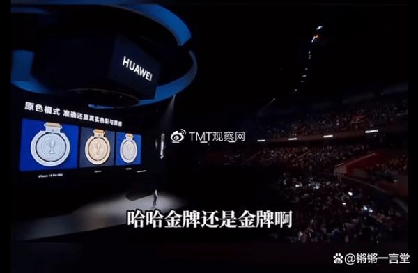 为了凸显P60的拍照功能,余承东以苹果和三星拍摄金牌做对比,并嘲讽道: