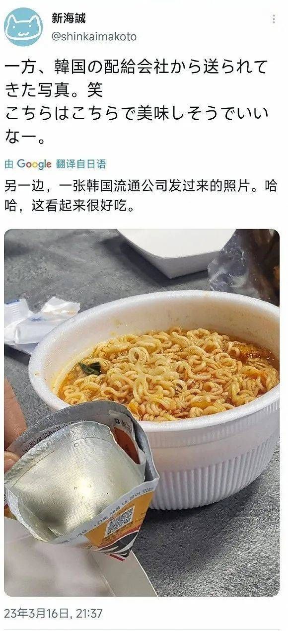 日本动画导演新海诚前段时间晒出了两张对比鲜明的“中韩工作餐”照片——在北京吃海鲜火锅,说“太豪华太震撼”;同一时间韩国发行团队向他发来了工作餐图片——速食拉面,配文“哈哈,这看起来很好吃”。此前新海诚也晒出过他在韩国吃拉面的图片。据凤凰娱乐报道,此事引发韩国网友热议,一些网友质疑新海诚“反韩”,但也不乏“但拉面看起来更好吃啊”的评论。