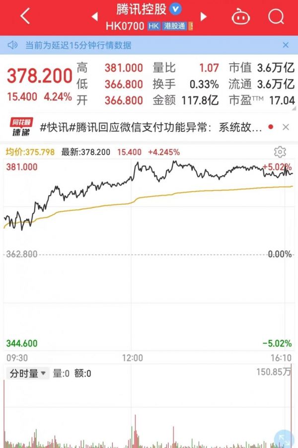 截至3月28日收盘,腾讯控股港股报378.2港元,当日涨幅4.24%。