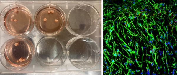 左图:类脑器官浮在为它们提供足够营养的培养皿中。每一个大概有一粒盐大小。右图:一棵类脑器官被切开并被染成绿色,呈现出一种被称为星型胶质细胞(astrocyte)的脑细胞。这些丰富的脑细胞为神经元的正常工作提供了关键的支持,包括维持它们的突触连接。