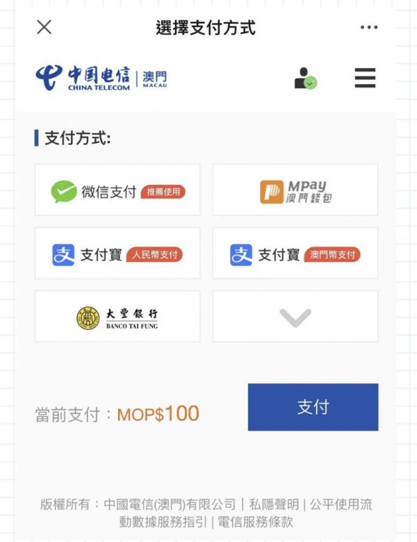 当然,这个不过期是前提条件的。按照中国电信(澳门)的规定,大湾区预付卡余额有效期为180天,至少每180天要充值一次,每次最低50澳门币(约合人民币43元)。充值渠道为官方微信公众号,支付方式包括微信、支付宝、银联等。