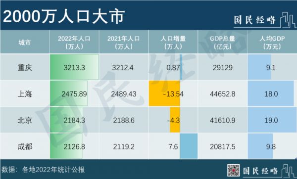 与之对比,作为我国人口第三大市的北京,2022年常住人口为2184.3万人,比上年减少4.3万人。