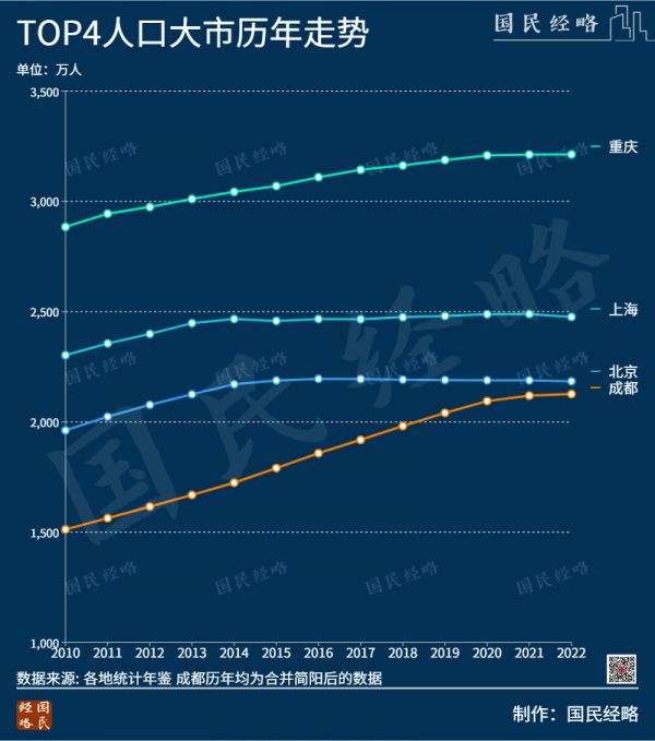 目前,全国共有280多个地市,但常住人口超过1000万的仅有17个,跻身2000万俱乐部的只有4个:重庆、上海、北京、成都。