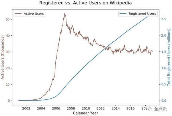 最典型的案例就是维基百科。自2000年初的维基百科诞生以来,一直到2007年初,维基百科都经历了近乎指数式的增长。在此后的12年里,维基百科失去了近43%的活跃贡献者,尽管在同一时期内,维基百科的用户总数增加了200多万。随着活跃用户的减少,最后社区男女比例也严重失衡,每10个活跃贡献者中,有9个是男性。