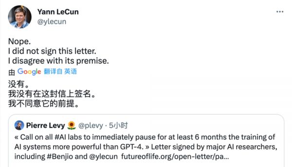 LeCun 的表态更加清晰。有人在推特上转发这封联名信,@LeCun 说他和“深度学习三巨头”的另一位 Benjio 都签署了这封联名信。Lecun 很快转发回应:“没有。我没有签署这封信。我不同意他的前提。”