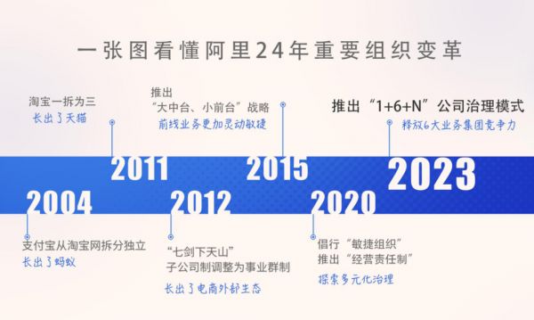 根据方案,在阿里巴巴集团之下,将设立阿里云智能、淘宝天猫商业、本地生活、国际数字商业、菜鸟、大文娱等六大业务集团和多家业务公司。业务集团和业务公司将分别成立董事会,实行各业务集团和业务公司董事会领导下的CEO负责制,阿里巴巴集团则将全面实行控股公司管理。根据全员信,张勇在担任阿里巴巴集团董事长兼CEO的同时,兼任阿里云智能集团CEO;戴珊任淘宝天猫商业集团CEO;俞永福任本地生活集团CEO;蒋凡任国际数字商业集团CEO;万霖继续担任菜鸟集团CEO;樊路远任大文娱集团CEO。其他公司也将独立经营管理。这轮变革从集团顶层入手,重新定义和构造阿里巴巴集团与各业务的治理关系,被认为是“阿里巴巴24年来最重要的一次组织变革”!