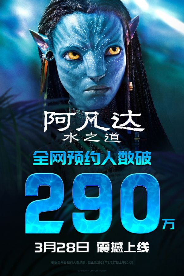 20 世纪影业表示,《阿凡达:水之道》全网预约人数已突破 290 万,该电影获得了全球影史票房第三、奥斯卡最佳视效奖的成绩。
