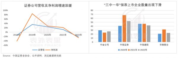 事实确实如此。中证协数据显示,近几年行业营收和净利润增速双双下滑,2022年更是负增长均超过20%。募资寒冬下,“三中一华”业绩也集体承压。