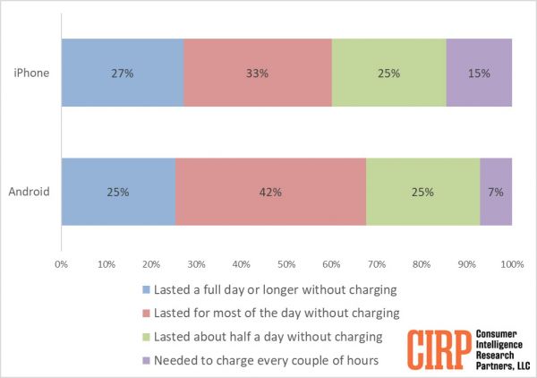 电池状况方面,四分之一左右的二手 iPhone 和安卓手机满电情况下可以使用一整天或者更长时间。33% 的 iPhone 机主表示可满足白天使用,42% 的安卓手机可满足白天使用。