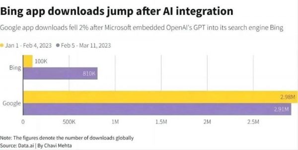 凭借投资Open AI,微软一改在移动生态全军覆没的弱势,在人工智能的新时代里支棱起来。集成OpenAI技术的新Bing,近一个月在全球应用市场的下载量暴增8倍。这还是在新Bing处在内测阶段,没有向所有用户开放的情况下。