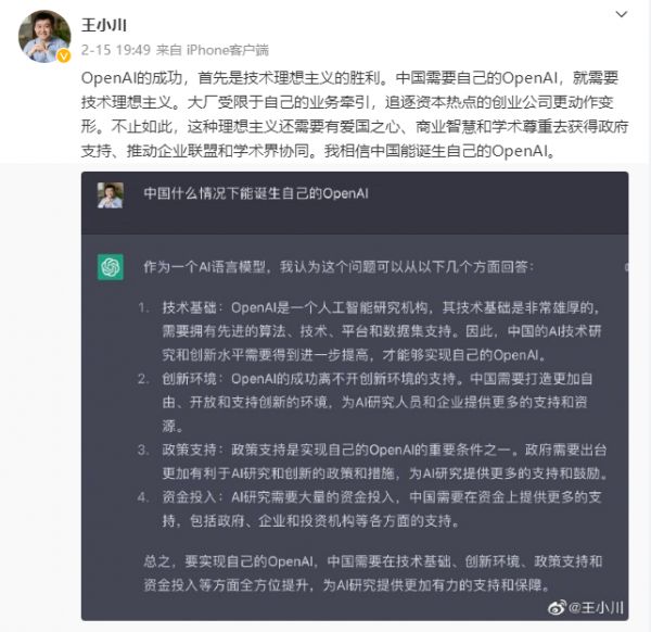 ChatGPT爆火之后,王小川在微博上说,OpenAI的成功,首先是技术理想主义的胜利。中国需要自己的OpenAI,就需要技术理想主义。