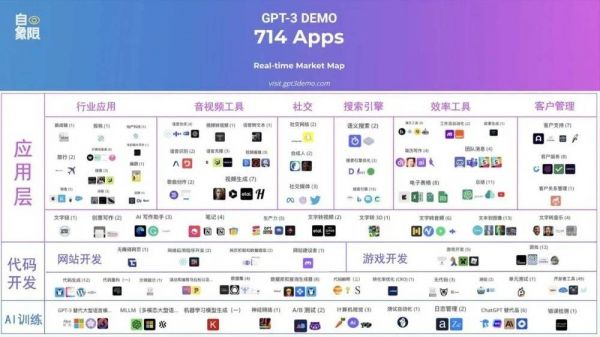 自象限整理了当下国外仅基于GPT-3 API接口所打造出的各类应用,并将已知的714个应用进行分类,其中覆盖了底层的AI训练、底层开发、应用开发等各个方面,并已经成长出各类行业应用,包括社交、效率工具、法律、音视频工具甚至还有2B应用的种子开始生长。