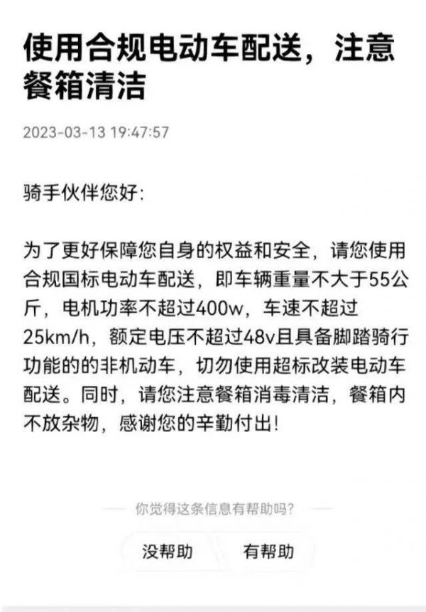 当然,平台也会想方设法地告诉骑手“安全第一”。3月初,美团发布了电动车合规使用的建议,其中提到“车速不超过25km/h”。