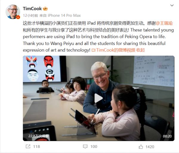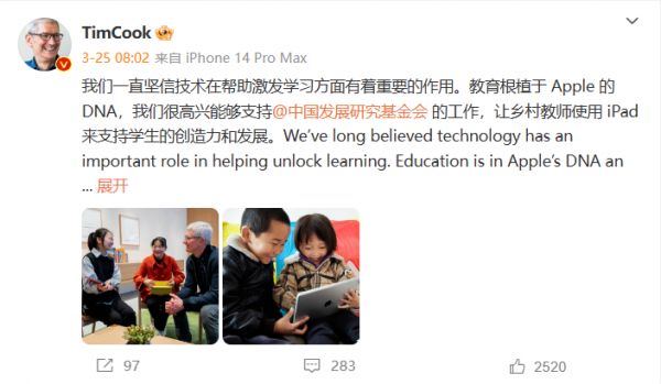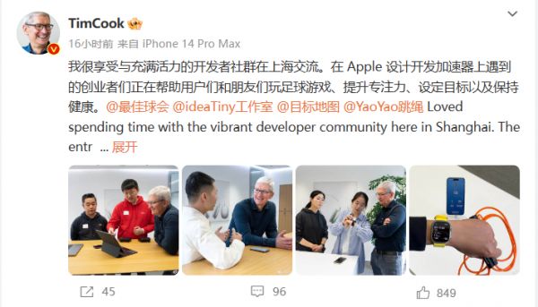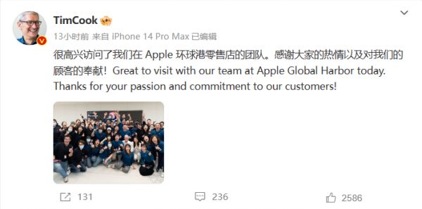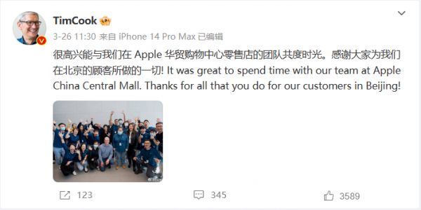 3 月 27 日,库克发文称很高兴与 Apple 王府井零售店的顾客和团队成员共度了一段美好时光。