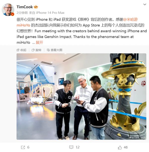 今日上午,库克在其微博发布图片,表示:“很开心见到 iPhone 和 iPad 获奖游戏《原神》背后的创作者。感谢米哈游的杰出团队向我展示你们如何为 App Store 上的每个人创造出沉浸式的幻想世界。”