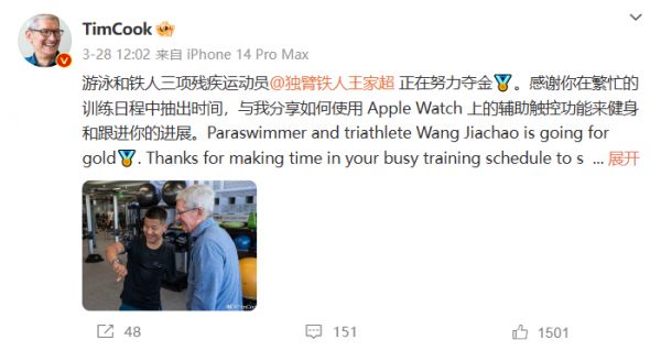 3 月 28 日,库克从北京飞上海,去了趟游泳和铁人三项残疾运动员王家超的训练基地,微博上,他晒了一张和王家超玩 Apple Watch 的图片。
