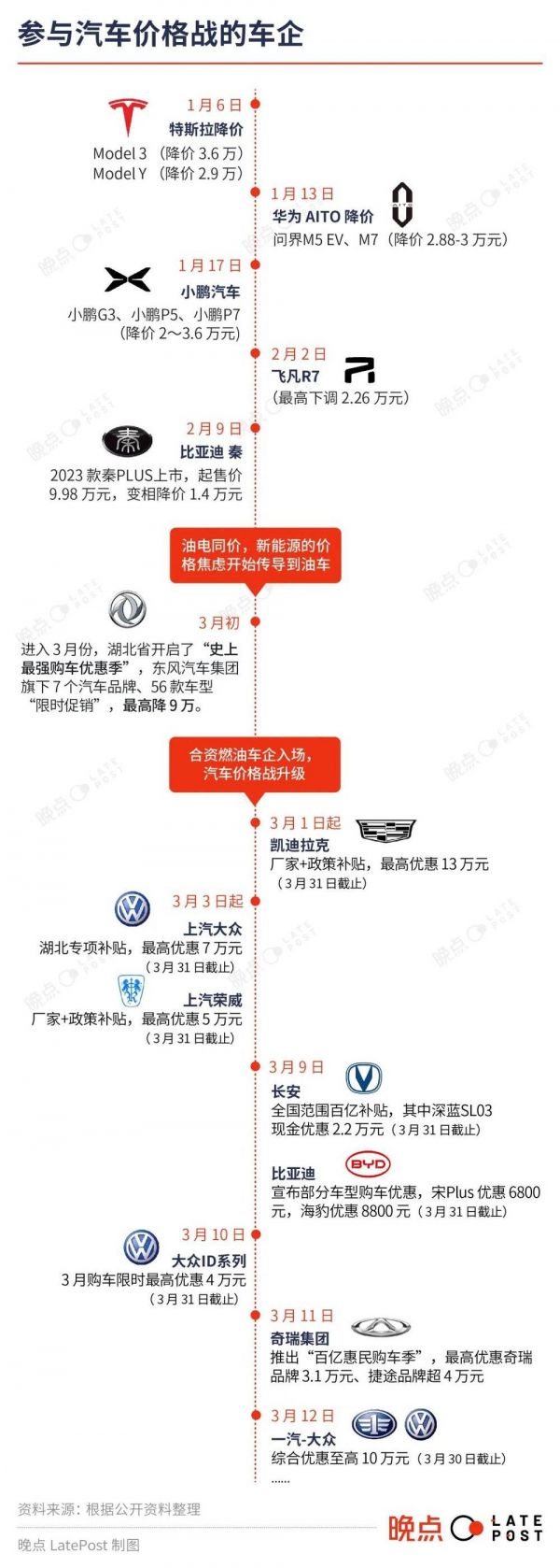 今年 1 月,特斯拉扔下第一颗炸弹,旗下 Model 3 和 Model Y 宣布降 2 万~4.8 万元。引线点燃后,产业链接连爆炸。2 月,比亚迪秦 PLUS 上市入门版降低到 10 万元以内,实现“油电同价”,10 余家新能源车企随即跟进。进入 3 月,东风汽车集团旗下包括东风日产、岚图、东风标致、东风雪铁龙等 7 个汽车品牌、56 款车型“限时促销”,最高降 9 万,成为合资燃油车降价的标志。近 40 家车企陆续跟进,价格战在燃油车阵营引爆。