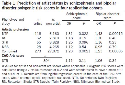 [6] Power Robert A., Steinberg Stacy., Bjornsdottir Gyda., Rietveld Cornelius A., Abdellaoui Abdel., Nivard Michel M., Johannesson Magnus., Galesloot Tessel E., Hottenga Jouke J., Willemsen Gonneke., Cesarini David., Benjamin Daniel J., Magnusson Patrik K E., Ullén Fredrik., Tiemeier Henning., Hofman Albert., van Rooij Frank J A., Walters G Bragi., Sigurdsson Engilbert., Thorgeirsson Thorgeir E., Ingason Andres., Helgason Agnar., Kong Augustine., Kiemeney Lambertus A., Koellinger Philipp., Boomsma Dorret I., Gudbjartsson Daniel., Stefansson Hreinn., Stefansson Kari.(2015). Polygenic risk scores for schizophrenia and bipolar disorder predict creativity. Nat Neurosci, 18(7), 953-5. doi:10.1038/nn.4040