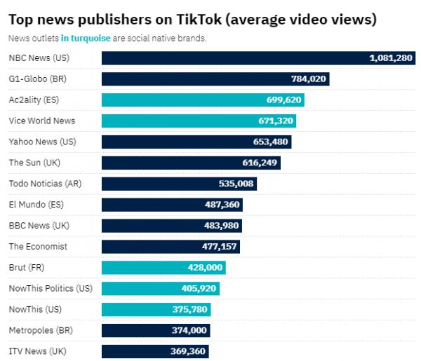TikTok上的头部新闻媒体(按平均视频浏览量排序)