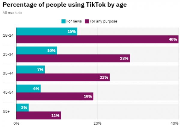 不同年龄段用户使用TikTik获取新闻或其他目的的占比情况