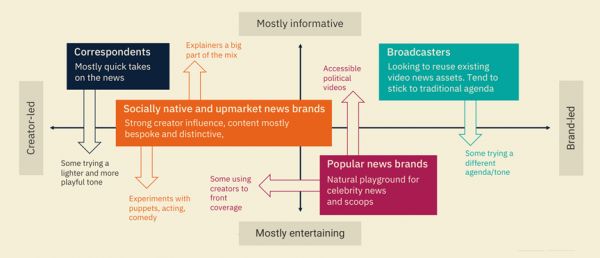 上图是由“创作者导向”“新闻编辑室导向”“更具信息量”“更具娱乐性”四个指标为轴构成的象限图。我们可以看到不同的媒体和个体在坚守自己的主要创作策略时,也会依据具体的内容类型与社会情境,兼容其他的策略。