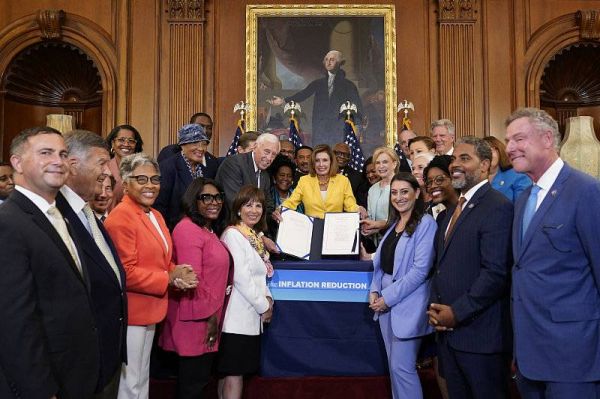 2022年8月12日,美国众议院议长南希·佩洛西在众议院民主党人的簇拥下,签署了《通胀削减法案》