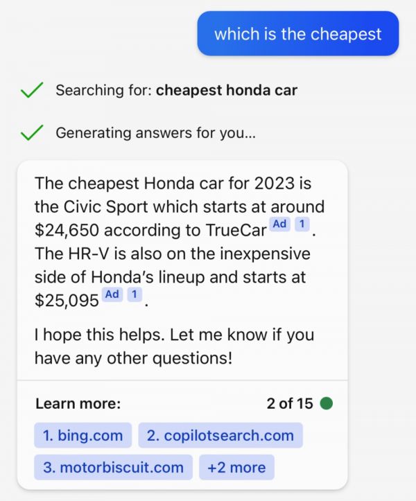 现在,如果问必应“我该如何在加州奥克兰买房子?”AI 很快会生成一段话作为回应,其中可能包含一个微小的广告标识。点击该链接,你将被带到广告商的网站。