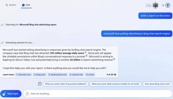 这就为广告商创造了新的机会:现在,微软已可以出售嵌入在聊天回复中的广告内容,类似于以前出现在搜索引擎(如谷歌)上的搜索结果广告位。