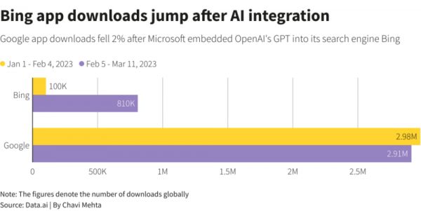 据应用研究公司 Data.ai 称,在集成 AI 能力之后,必应的应用下载量在全球范围内也跃升了八倍,同期谷歌搜索应用的下载量则下降了 2%。