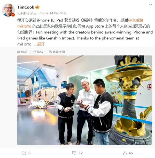 苹果 CEO 库克前往米哈游,与《原神》创作者交谈