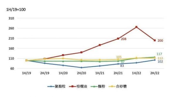 康师傅在财报中表示,在聚酯粒、棕榈油、面粉、白砂糖等公司主要原材料采购品类中,2019~2021年,棕榈油价格大幅上涨,并在2022年6月攀升至2.5倍涨幅后,又回落至2022年初的水平,而聚酯粒、面粉、白砂糖的价格变动一直处在相对稳定的状态。