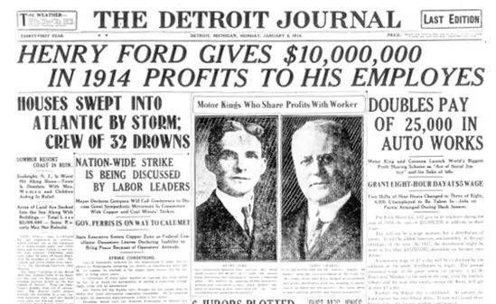 1914年,福特公司将9小时工作时间缩短为8小时,并提高了工人的薪水(见Ford Corporate Home)