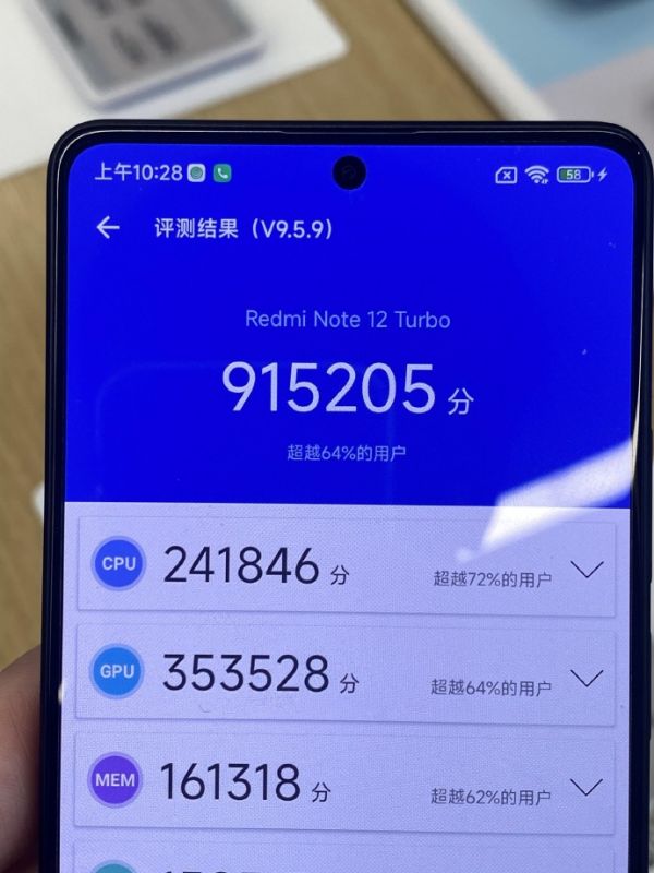 在性能方面,红米Note 12 Turbo首发搭载骁龙7 Gen 2,采用了和骁龙8+一样的架构和工艺,被很多人认为是骁龙8+的锁定板,所以性能表现十分强劲。在发布会上卢总骄傲宣布这款新机的安兔兔跑分达到101万+,但在店里开启性能模式尝试跑了好几次,结果都显示91W+,真心想不出来卢总这分数是怎么跑出来的,毕竟10W分的差距在性能表现上十分明显了。