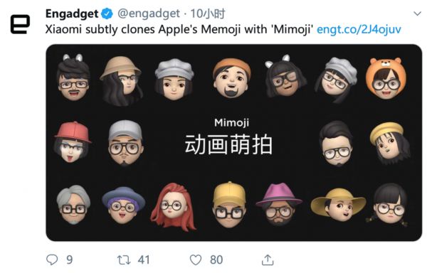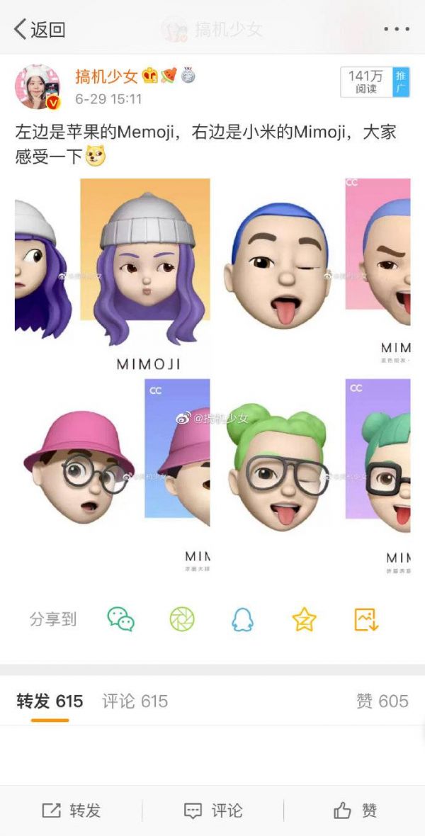 6 月 29 日,微博博主@搞机少女,晒出一组苹果 Memoji 与小米 Mimoji 的对比图,博主言辞中没有提到抄袭与否,也没有提到图片的来源,但由于形象实在太过接近,再加上苹果 Animoji 推出在前,很快,抄袭论淹没了小米。