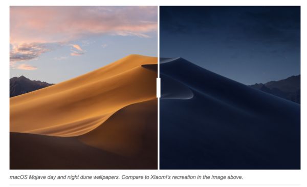 更早一点的 2 月,小米 9 内置的动态壁纸,因为设计风格,以及随时间变换的逻辑,与苹果的 macOS Mojave 相近,也受到了关于抄袭的指责。The Verge 对此的评论是,“小米一直肆无忌惮地抄袭苹果。”