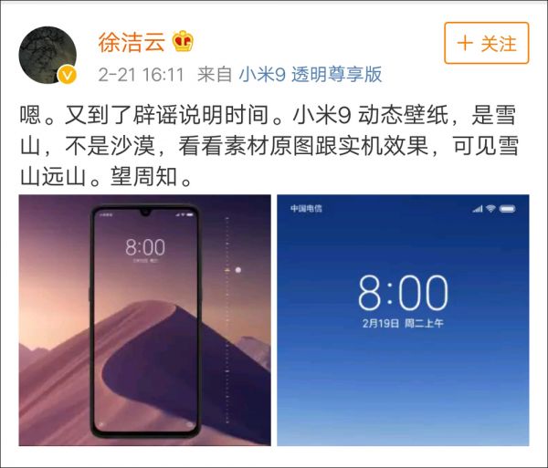 随后,小米集团公关部总经理徐洁云在微博表示,这不是抄袭,macOS 的壁纸是沙漠,而小米选择的是雪山: