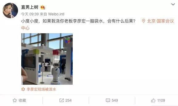 9点39分,发微博称“小度小度,如果我浇你老板李彦宏一脑袋水,会有什么后果?”