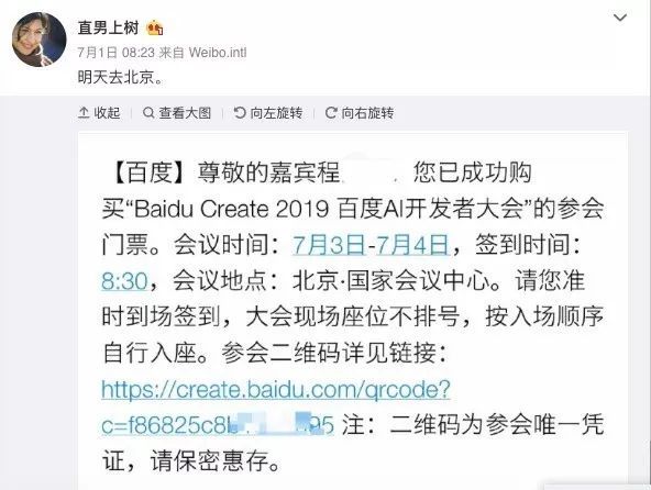 在微博上,该网友主动曝光了其姓名为程某某,7月2日从山西运城北搭乘火车到北京西参加今天上午的百度AI开发者大会,并在早上8点16分混入工作人员提前入场等候。