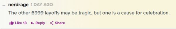 一名网友说:其他6999个员工被裁员是悲剧,但这一个值得庆祝。