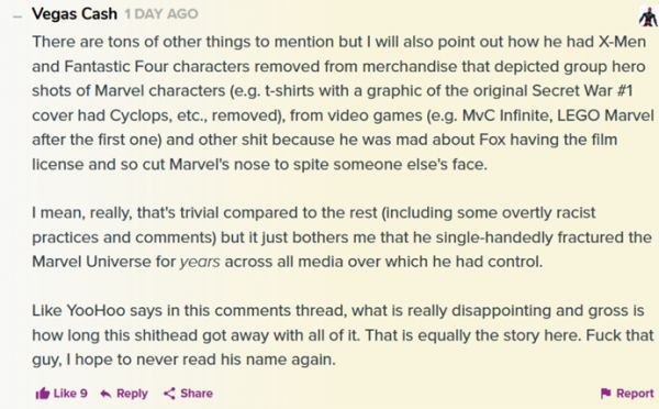 还有的人在幸灾乐祸:“超爱这个消息。当初他卖了漫威,现在他被解雇了。”