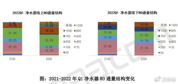 与此同时,线上净水器近两年呈现出大通量产品迭代的趋势,消费者也愿意为大通量净水器买单。预计未来两三年内,线下净水器产品也将跟随线上追求大通量的趋势进行迭代。据奥维云网(AVC)的监测数据显示,2022年第一季度以500G通量为临界点,500G以下通量的净水器销售额的占比均呈现出下降的趋势,500G以上通量的净水器销售额则呈现出显著上升的趋势。