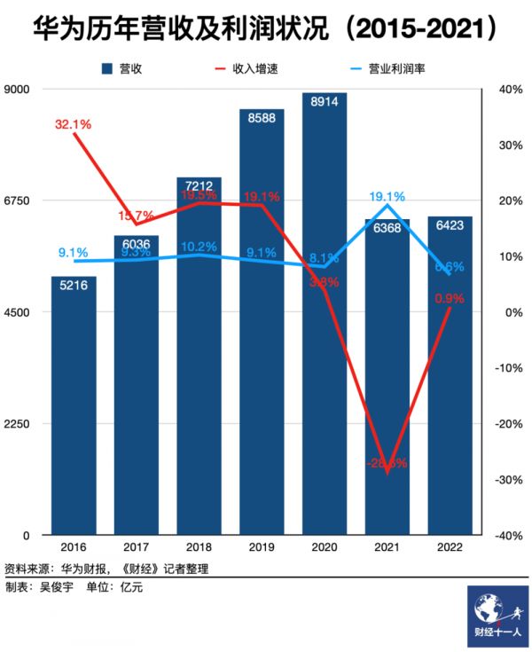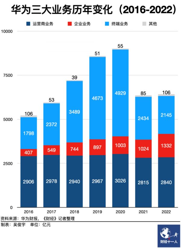 财报显示,2022年,华为全年营收6423亿元,同比增长0.9%;营业利润422亿元,同比下滑65.2%;营业利润率6.6%,为历史最低水平。其中,运营商业务营收2840亿元,同比增长0.9%;企业业务1332亿元,同比增长30.0%;终端业务2145亿元,同比下滑11.9%。