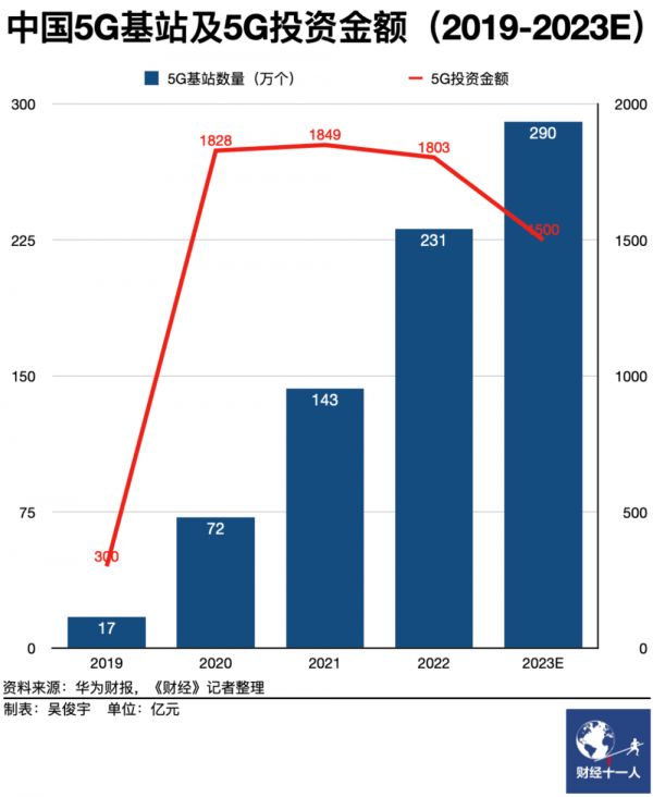 华为运营商业务目前面临中国5G开支下滑的挑战。该业务收入主要来自三大电信运营商(中国移动、中国电信、中国联通)。2020年~2022年是中国5G基站建设高峰期,三大运营商每年合计要花费超过1800亿元采购5G基站。华为是其中最大受益者。