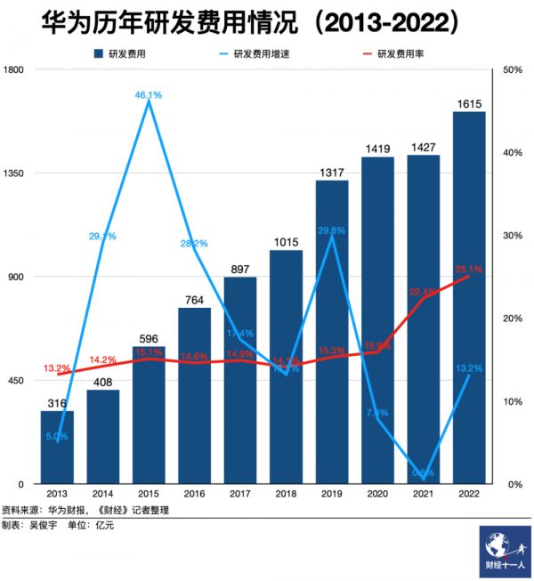 多轮制裁让华为内部放弃依赖美国技术的声音愈加强烈。在此背景下,华为按照“一切只能靠自己”的原则,持续“压强式”投入研发费用。