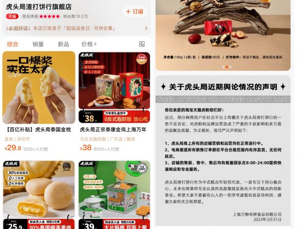 3月31日下午,对于近日网传的新中式点心品牌虎头局渣打饼行倒闭的消息,虎头局在天猫店发布公告回应称,倒闭信息不实,线上所有的店铺正常运营,订单将有序发货,无任何延迟。