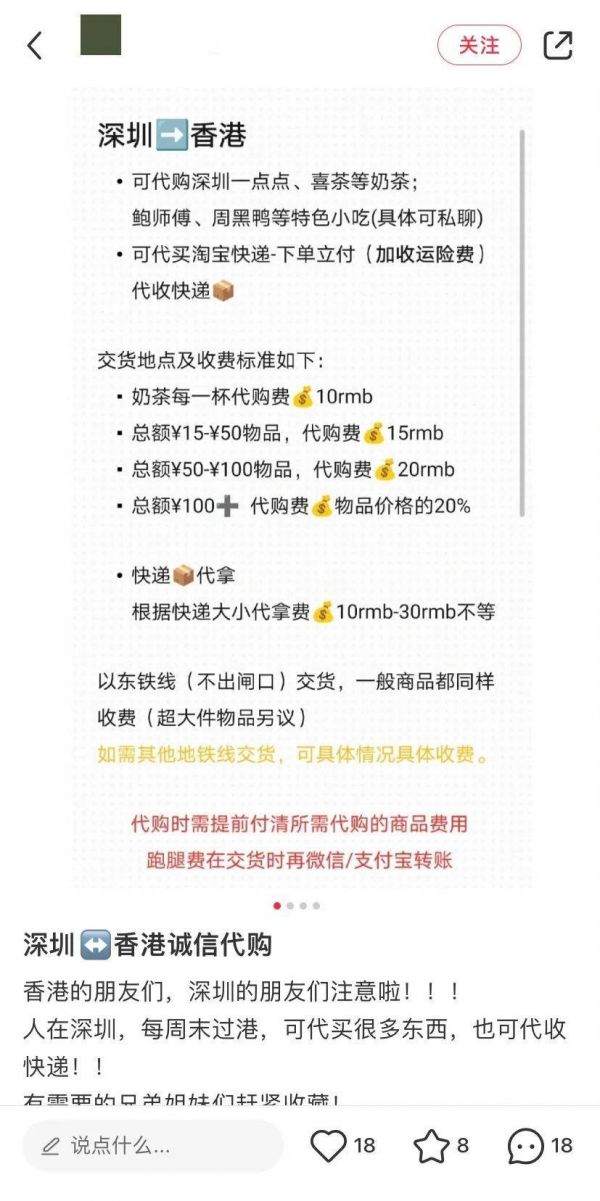 时代记者注意到,在某社交平台一条3月2日发布的“深圳代购奶茶回香港,明天可以继续预约”的帖子下面,有网友询问“这也代购,香港没有珍珠奶茶吗?”,这条留言得到了作者的回复:“香港有,但是内地的更划算更好喝。”