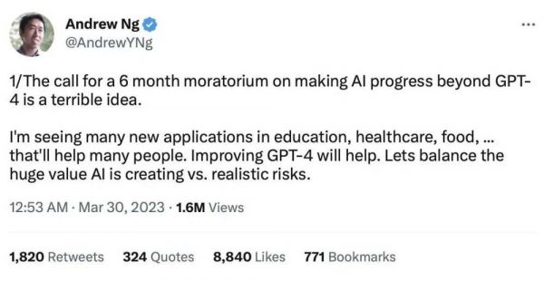 著名计算机科学家、Google Brain 的联合创始人吴恩达在社交媒体上发表了他对这封信的看法。