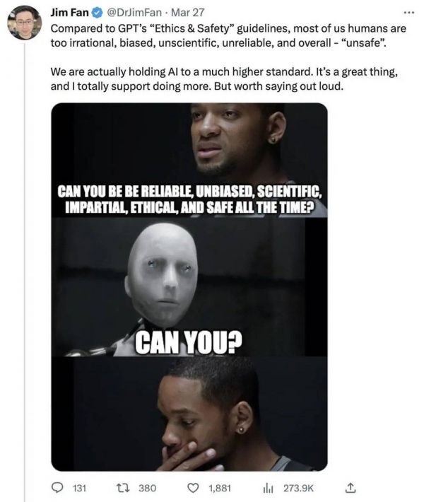 针对大语言模型的安全性,英伟达 AI 科学家 Jim Fan 提出了一个有意思的观点。
